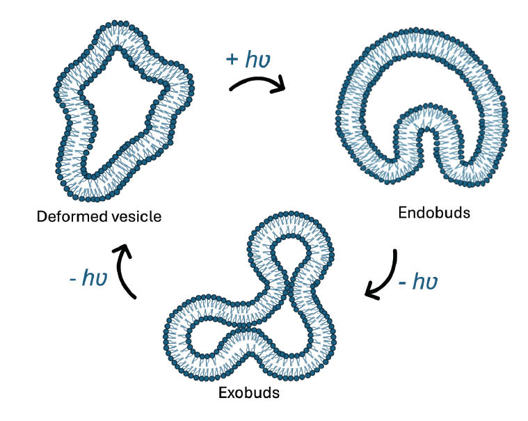 The ability to externally control membrane morphology is central to engineering responsive artificial cells and to understanding how primitive protocells might have behaved in fluctuating environments. Here we show that illumination of vesicles containing aqueous dyes produces rapid, reversible, and dye-dependent remodeling of membrane curvature. Giant unilamellar vesicles undergo inward and outward budding, reversible adhesion, and fusion under sustained illumination, relaxing to a new steady-state shape while light is applied. The direction of curvature switching depends sensitively on the identity of the encapsulated dye and buffer, indicating that light perturbs the solute-membrane interactions and thus the spontaneous curvature. Together, these results establish a chemically mediated, dissipative mechanism for light-controlled curvature switching that operates in both phospholipid and fatty acid membranes. This provides a simple, generalizable strategy for actuating shape in synthetic cells and suggests how environmental light cues could have driven dynamic behaviors in early protocellular systems. Harnessing light to induce reversible shape changes could potentially unlock new avenues in synthetic biology, the design and manipulation of microscopic 'swimmers', tissue engineering, and responsive materials.